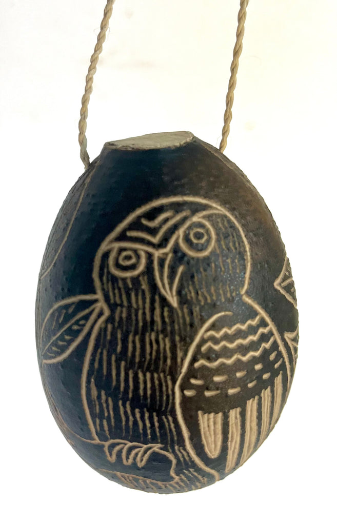 From the Amazon jungle, a sweet-sounding shaker finely carved with assorted Birds and Butterflies. Also hangs as an ornament. 3" tall.