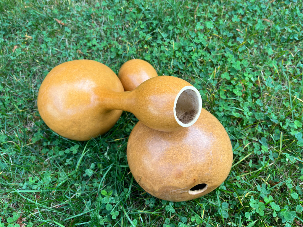 Adenkum Gourd Calabash Instrument. Hollow and long-necked traditional instrument. Players create sounds from the empty chamber by pounding the top hole and flipping the gourd against legs and arms. Bulb dimensions 6-10" wide and handles 8-12" long. - Ghana